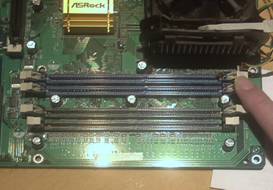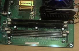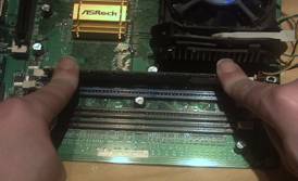 Wichtig: Das Motherboard muss planaufliegen, ansonsten könnte beim Eindrücken des Speichers die Platine unten leichte Risse bekommen. Bitte drücken sie immer nur mit den Fingern. Wenn die Halterungen von selbst hochklappen und vor allem auch einrasten ist der Speicher drin.