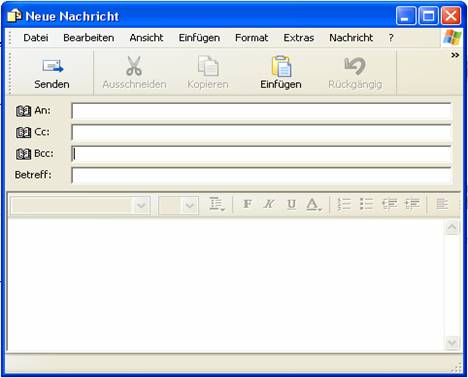 Hier kann man neue Emails schreiben. Sie geben die Email Adresse, Betreff und Text an. Mit einem Strichpunkt zwischen verschiedenen Emailadressen kann an mehrere Personen ein und dieselbe Email gesendet werden. Sollten Sie ein Email an mehrere Freundinnen schreiben, so sollten Sie die Adressen bei BCC eintragen. Dies bedeutet, dass der Empfänger nicht die anderen Empfänger sieht und es spart jede Menge Geld für Blumen. Sollte es nicht da sein, können Sie es über Ansicht und alle Kopfzeilen einblenden. Noch etwas wichtiges: Bitte wählen sie einen vernünftigen Betreff. Kein Betreff oder unleserlicher Betreff wird von den Spamfiltern ausgesiebt. Kurz gesagt Ihr Email kommt nie an.