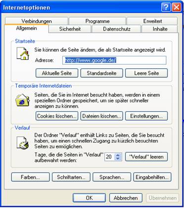 1. Allgemein: Hier legt man die Startseite(diese Seite erscheint beim öffnen des Browsers) fest. Viel wichtiger ist das Löschen der temporären Dateien und des Verlaufs. In den Einstellungen der temporären Internetdateien kann man die Grösse des Speichers festlegen. 10 MB ist völlig ausreichend. Wird er zu gross gewählt braucht der Rechner länger zum Suchen, als wenn er die Seite sofort geladen hätte. Den Verlauf leeren ist nicht gut für den Speicher, aber vielleicht für den Familienfrieden. Hier kann man sehen auf welchen Seiten man die letzten Wochen war.