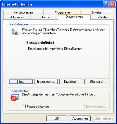 3. Datenschutz: Unter Erweitert können Cookies an- und ausgeschaltet werden. Cookies sind kleine Texte die für jeweils eine Seite Daten auf dem Rechner speichern. Cookies haben einen schlechten Ruf, obwohl sie relativ harmlos sind. Jedoch ist hier mehr das Problem, dass die Daten auf der Festplatte schlummern. Das wäre es auch schon zu dem Reiter.