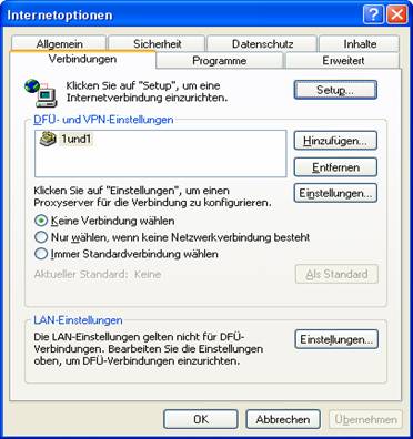 5. Verbindungen: Hier können Sie Verbindungen erstellen, löschen und bestimmen, welche standardmäßig verwendet werden sollen. Wenn Sie selbst eine Anwahl machen sollte der Punkt am besten auf „Immer Standardverbindung wählen“ stehen. Bei Routerbetrieb auf jeden Fall bei „Keine Verbindung wählen“. Somit sind wir auch schon bei den LAN-Einstellungen. Hier werden die Netzwerkeinstellungen fürs Internet konfiguriert. Klickt man auf Einstellungen, erscheinen Proxy Einstellungen. Ein Proxy Server wird benutzt um über eine Umleitung auf das Internet zuzugreifen. Früher wurde es gemacht um höhere Geschwindigkeiten zu erreichen. Die gewünschte Seite wurde schnell auf den Server geladen und der Benutzer hat sie vom Server abgeholt. Sie müssen sich das so vorstellen, dass es einen Kuchen gibt und alle einfach von dem Kuchen mit den Händen rausreißen was sie können. Der Kuchenteller ist der Proxy. Von diesem kann man nun in Ruhe und so schnell man will essen. Heute wird der Proxy benutzt um sozusagen die Fingerabdrücke im Kuchen zu verschleiern. Genau so bekommt die eigentliche Seite nur die IP vom Proxy und nicht ihre Persönliche. Wobei Sie sich denken können, dass nicht alle Seiten mit Proxy funktionieren. Vor allem die sicheren Seiten (Schloss, https??) und auch Chatseiten.