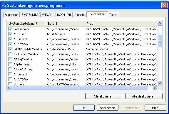 Hier können Sie nun durch anhaken bestimmen was gestartet wird und was nicht. Die Spalte Befehl gibt ihnen noch weitere Hinweise zum Programm und dem Ort wo es liegt. Wenn Sie ihre Entscheidung getroffen haben klicken Sie auf Übernehmen  und auf OK. Danach werden Sie aufgefordert den Rechner neu zu starten. Diese Programme werden nur nicht gestartet die Installation bleibt erhalten. Die Programme können weiterhin über das Startmenü verwendet werden.